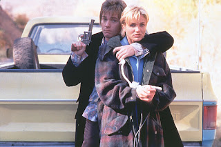 Helping out with the visual trickery of the film is cinematographer and future filmmaker Barry Sonnenfeld who brings a lush, ominous look to the film with its blue filters in some of the night scenes while the road scenes are even more creepy to look at. Sonnenfeld, like latter-day Coens cinematographer Roger Deakins, is a master at visual manipulation since the film plays up to its evocatively moody tone. With the fast-paced editing done by the Coens under their Roderick Jaynes moniker along with Don Weigmann that helps enhance the intensity of the movie.